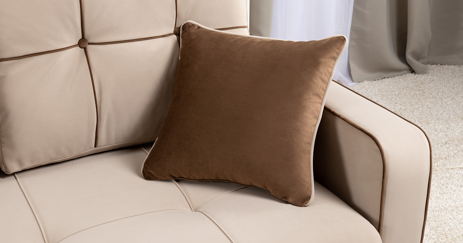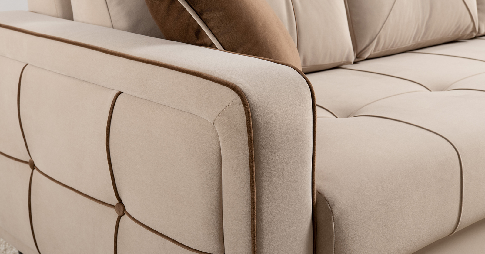 Декоративные канты на подушках и вставке подлокотников. Пуговицы в местах пересечения кантов на подушке и вставке подлокотников. По торцам подлокотников и думках контрастный декоративный кант. Защипы на сиденье и средней большой подушке.