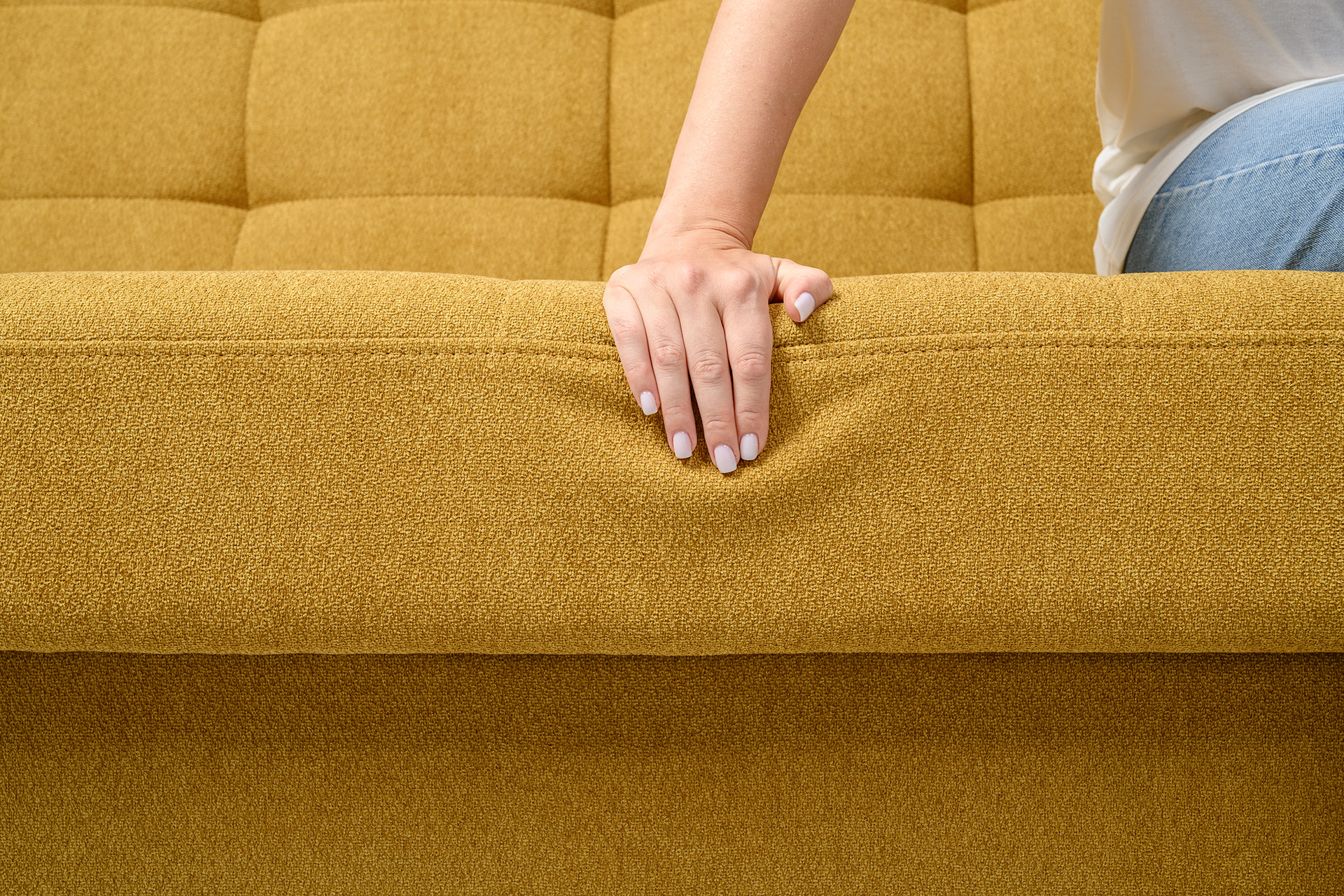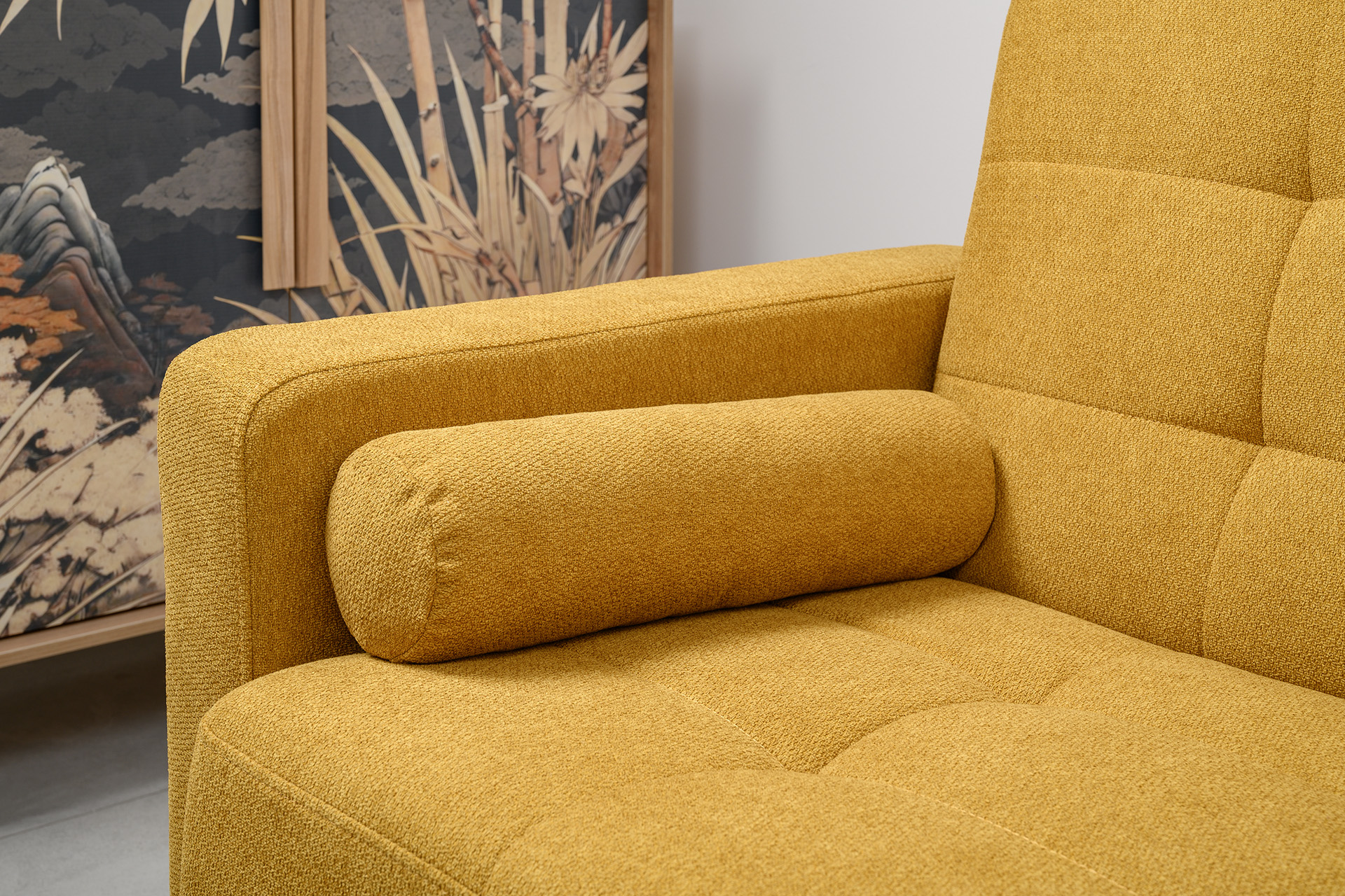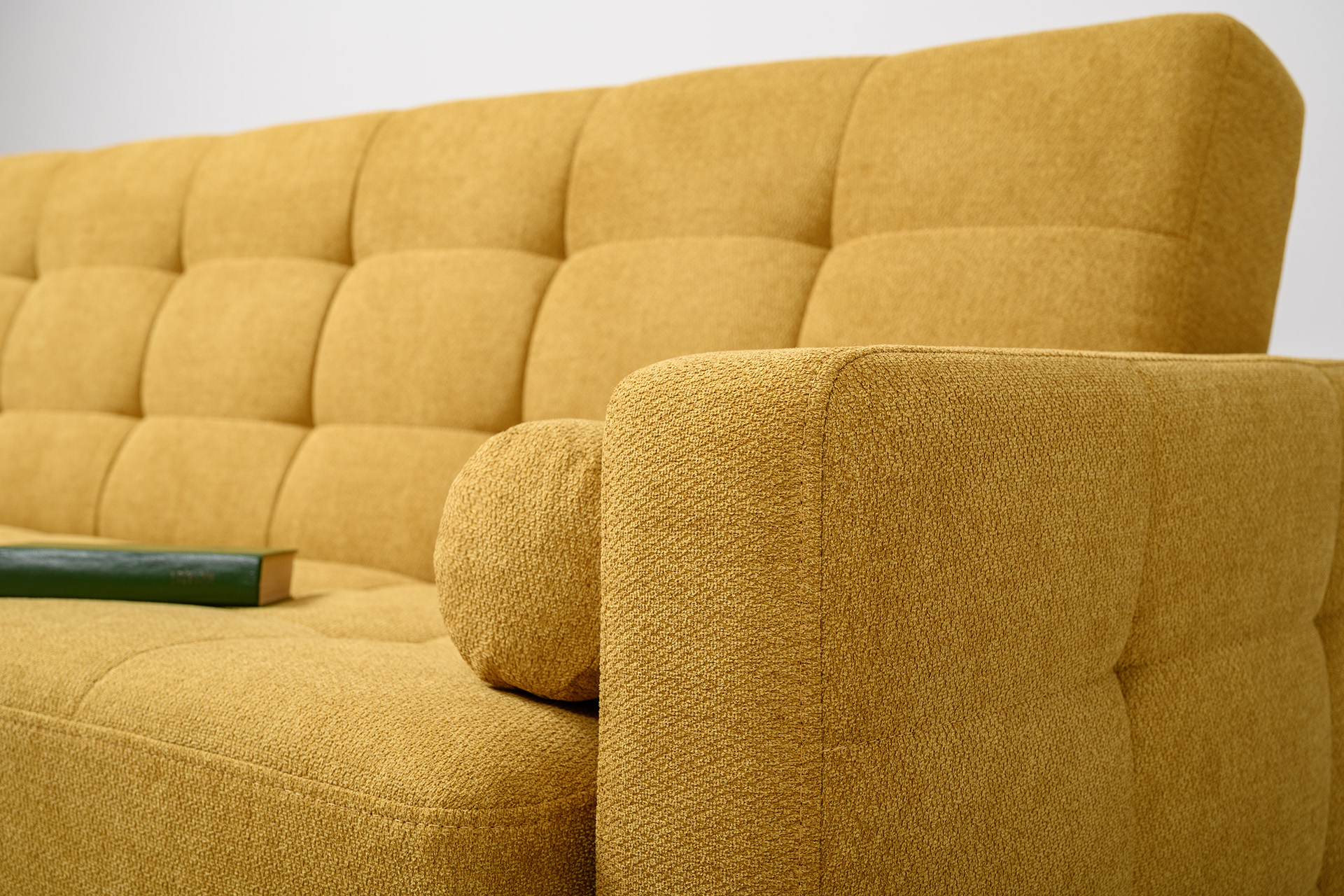 Прямоугольная стежка по спинке, посадочному месту и подлокотниках, круглые подушки-валики
