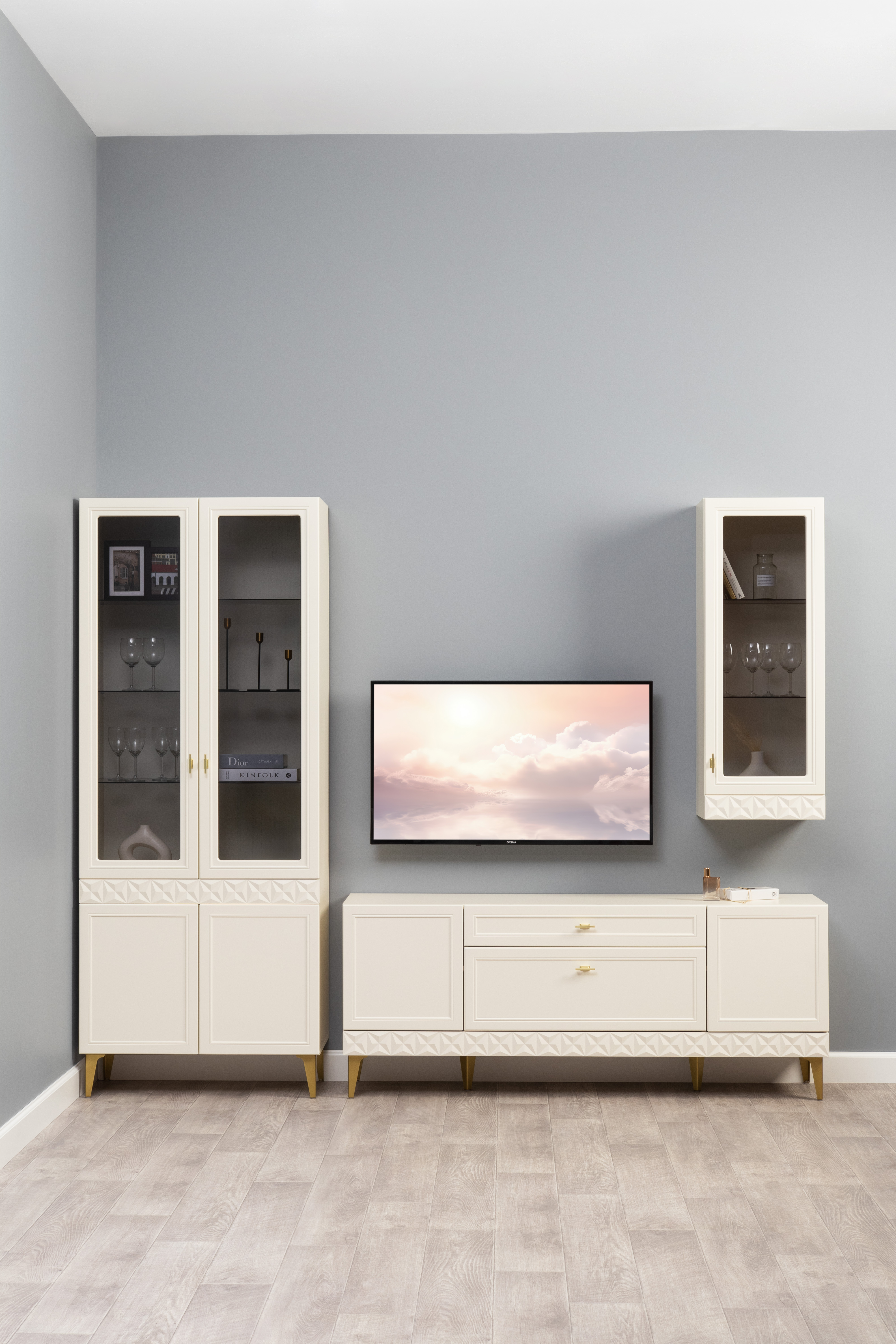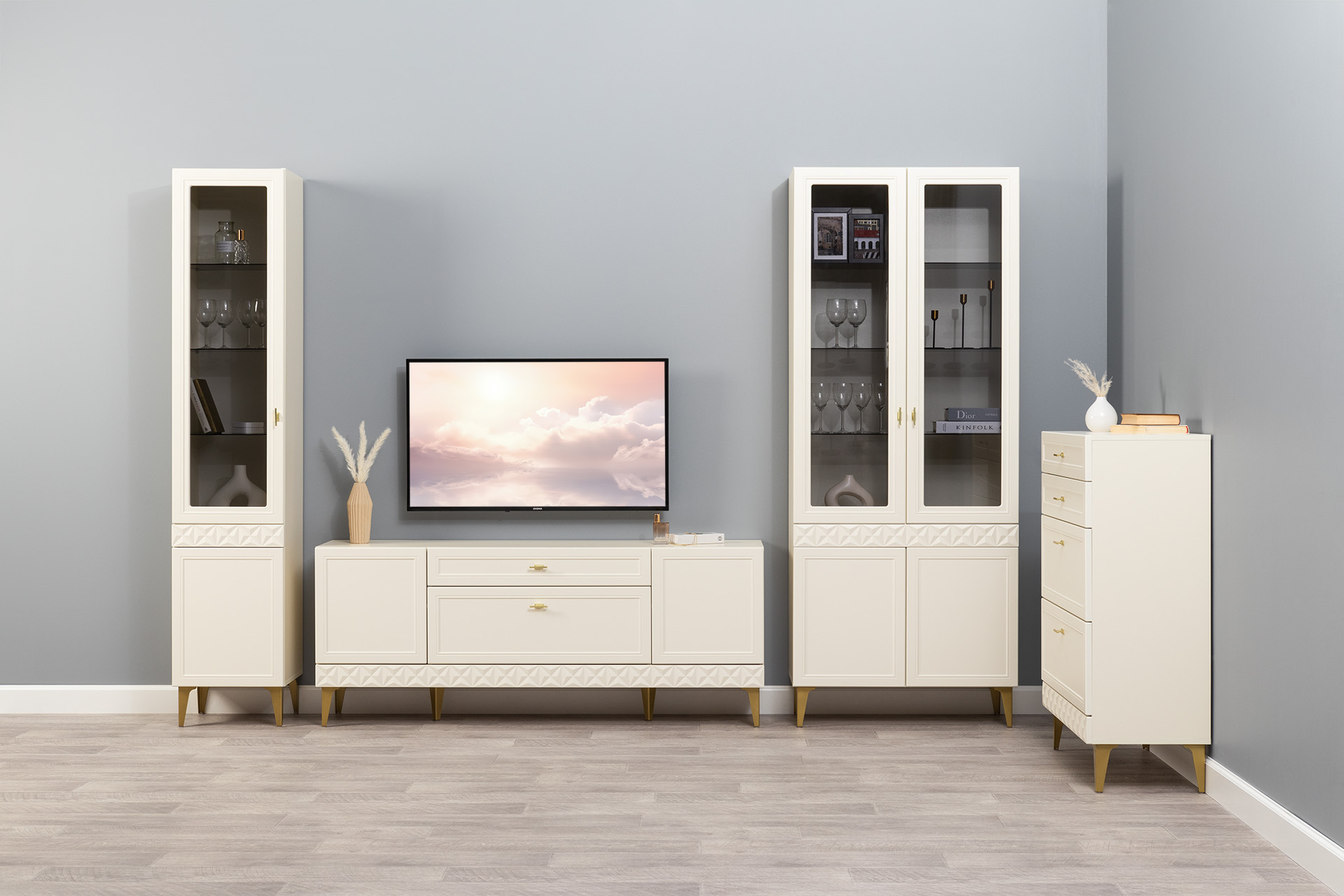 Гостиная Марион композиция 3 слоновая кость С341 PE, слоновая кость 6898 ПВХ, белый PE шагрень (собирается на любую сторону)