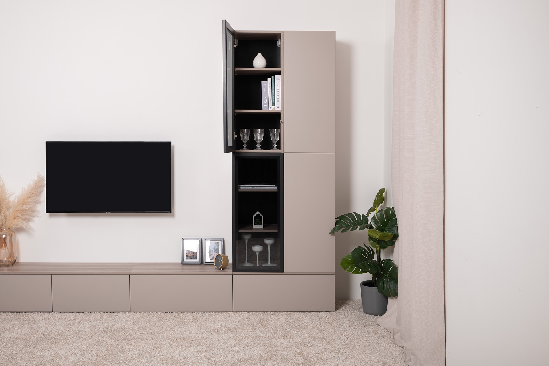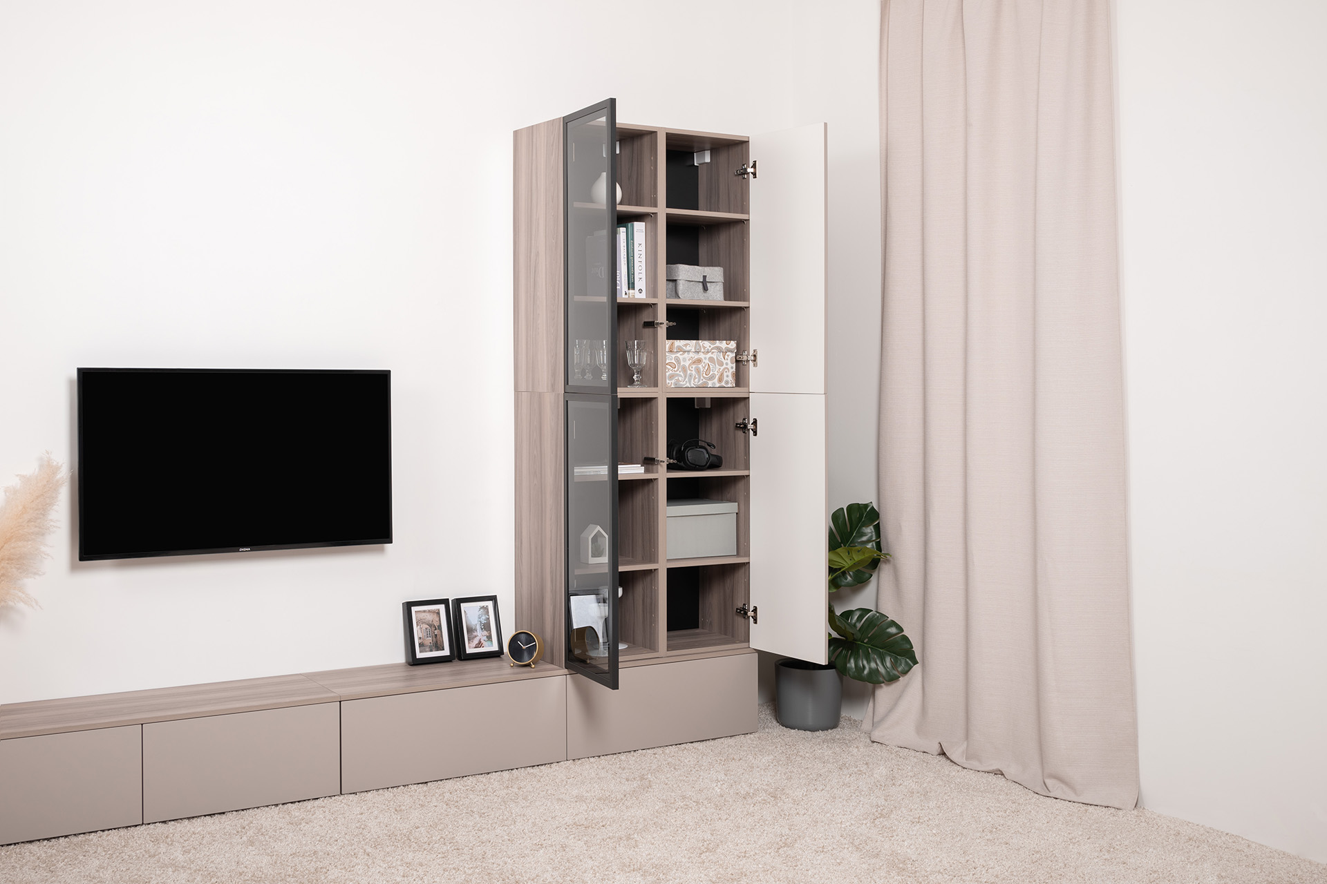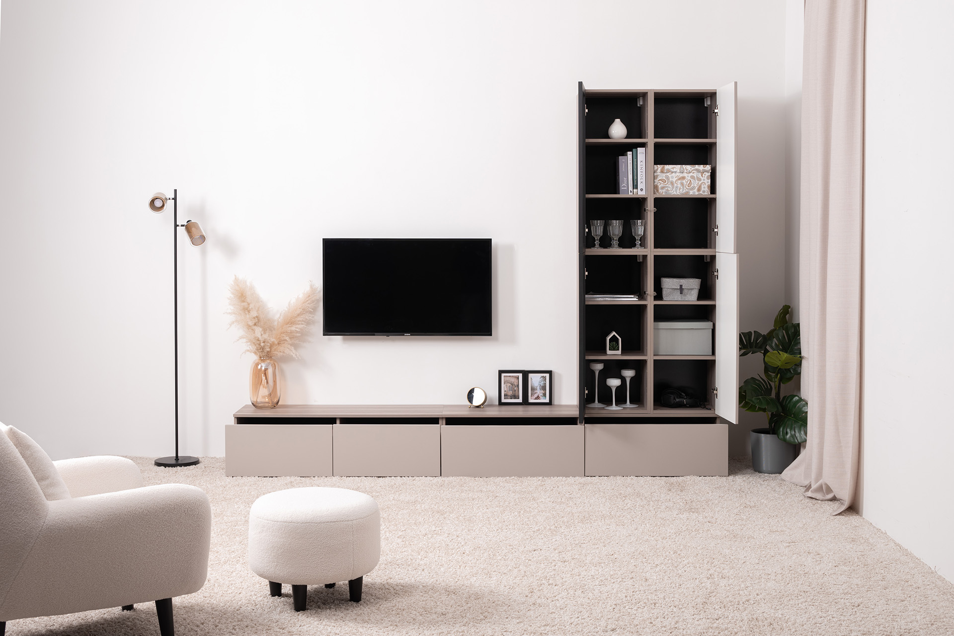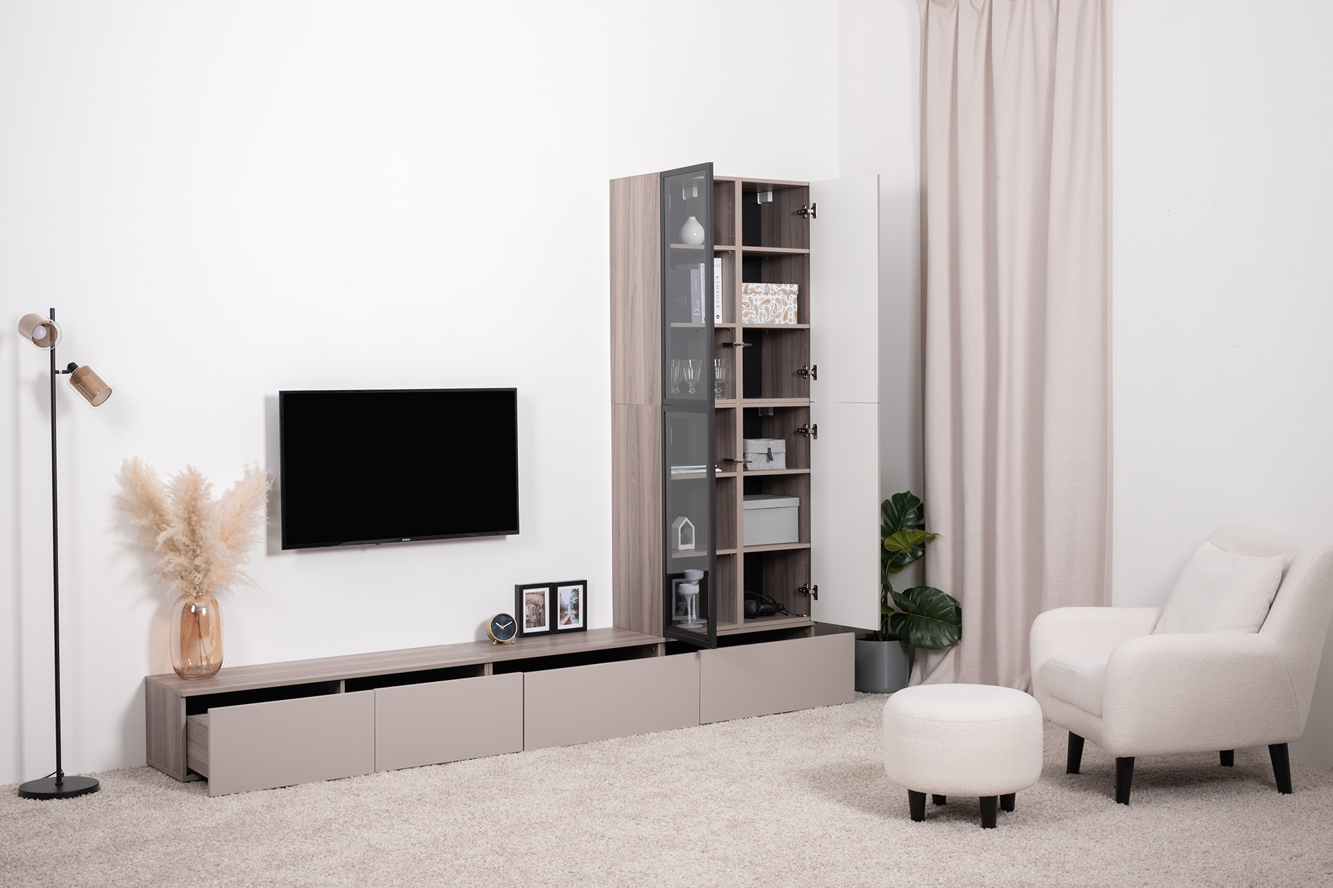 Разнообразие модулей и возможность их напольной и настенной установки позволит создать гостиную оптимальной конфигурации. Распашные фасады с механизмом push-to-open, направляющие скрытого монтажа в ящиках, петли с доводчиками, регулируемые опоры, крепеж в комплекте – комфорт продуман до мелочей.