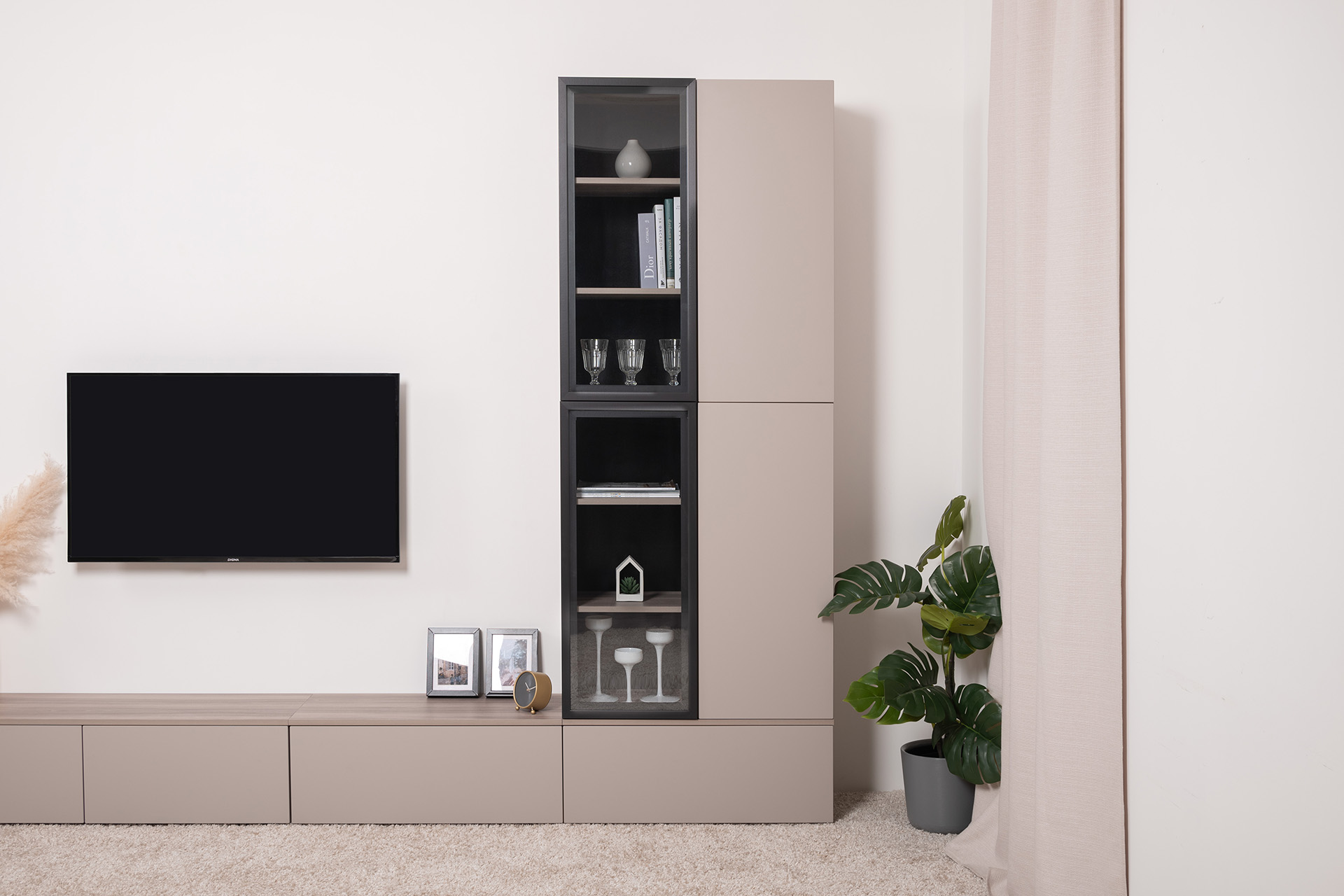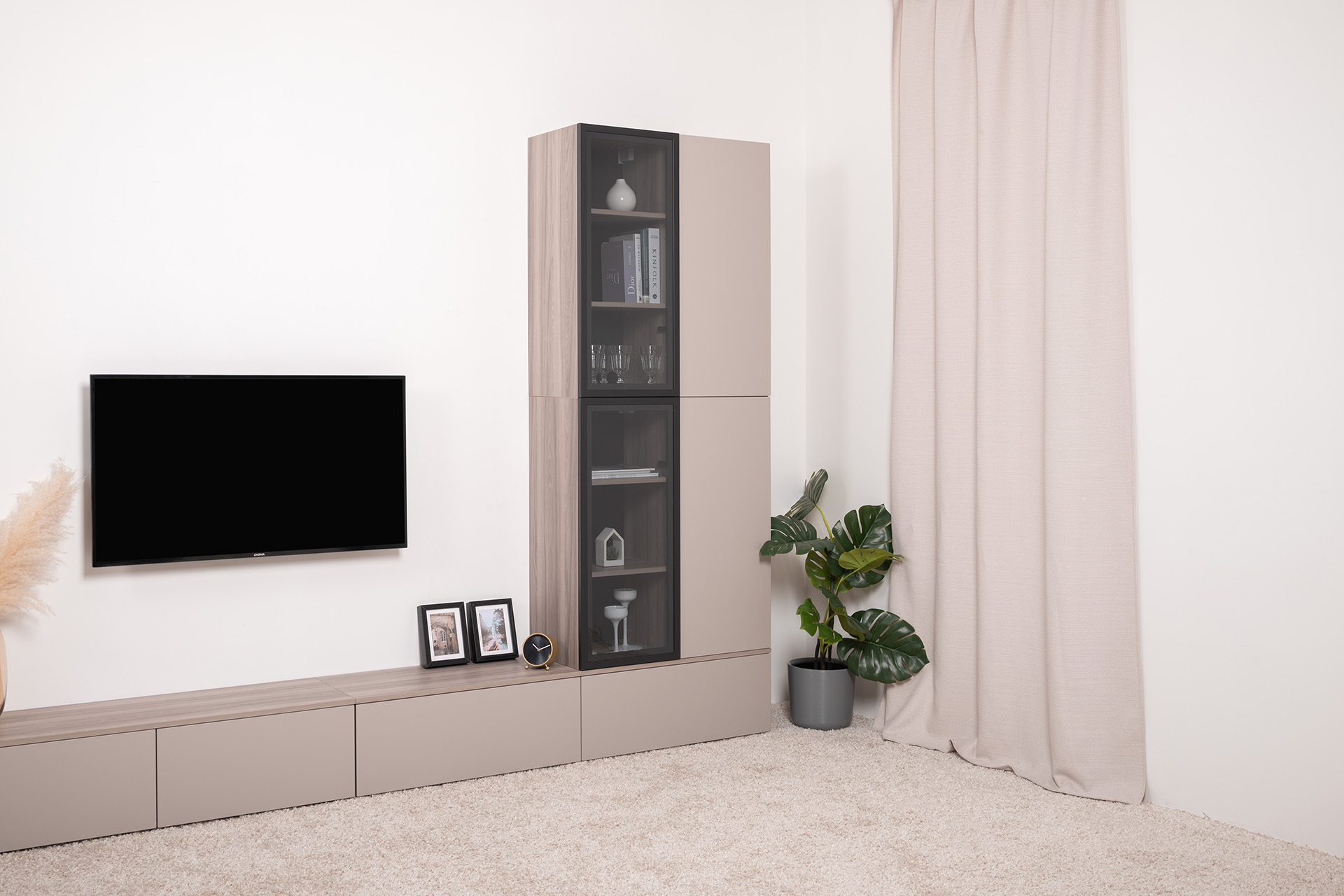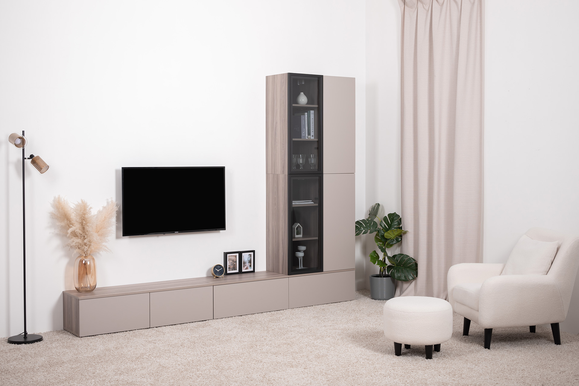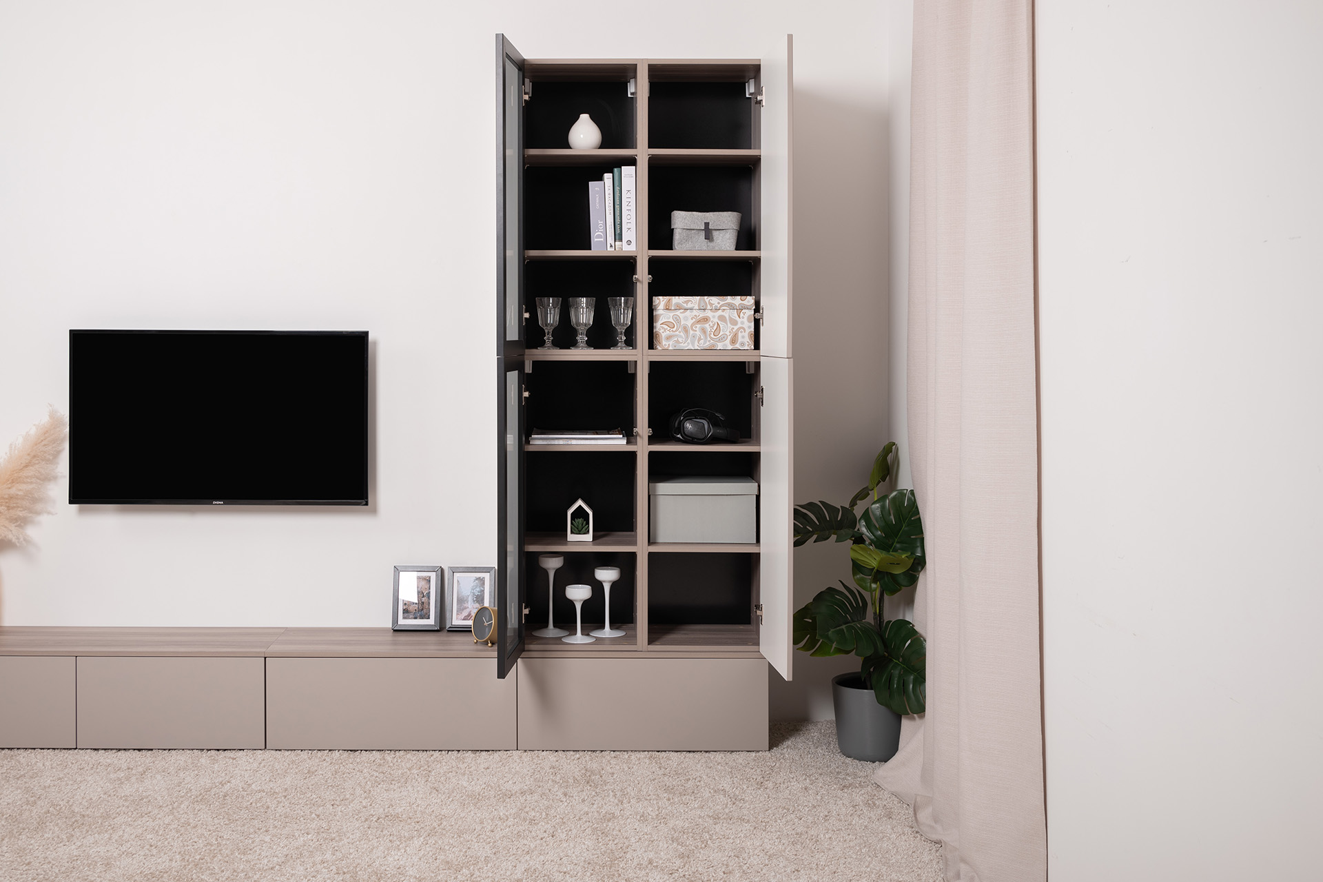 Разнообразие модулей и возможность их напольной и настенной установки позволит создать гостиную оптимальной конфигурации. Распашные фасады с механизмом push-to-open, направляющие скрытого монтажа в ящиках, петли с доводчиками, регулируемые опоры, крепеж в комплекте – комфорт продуман до мелочей.