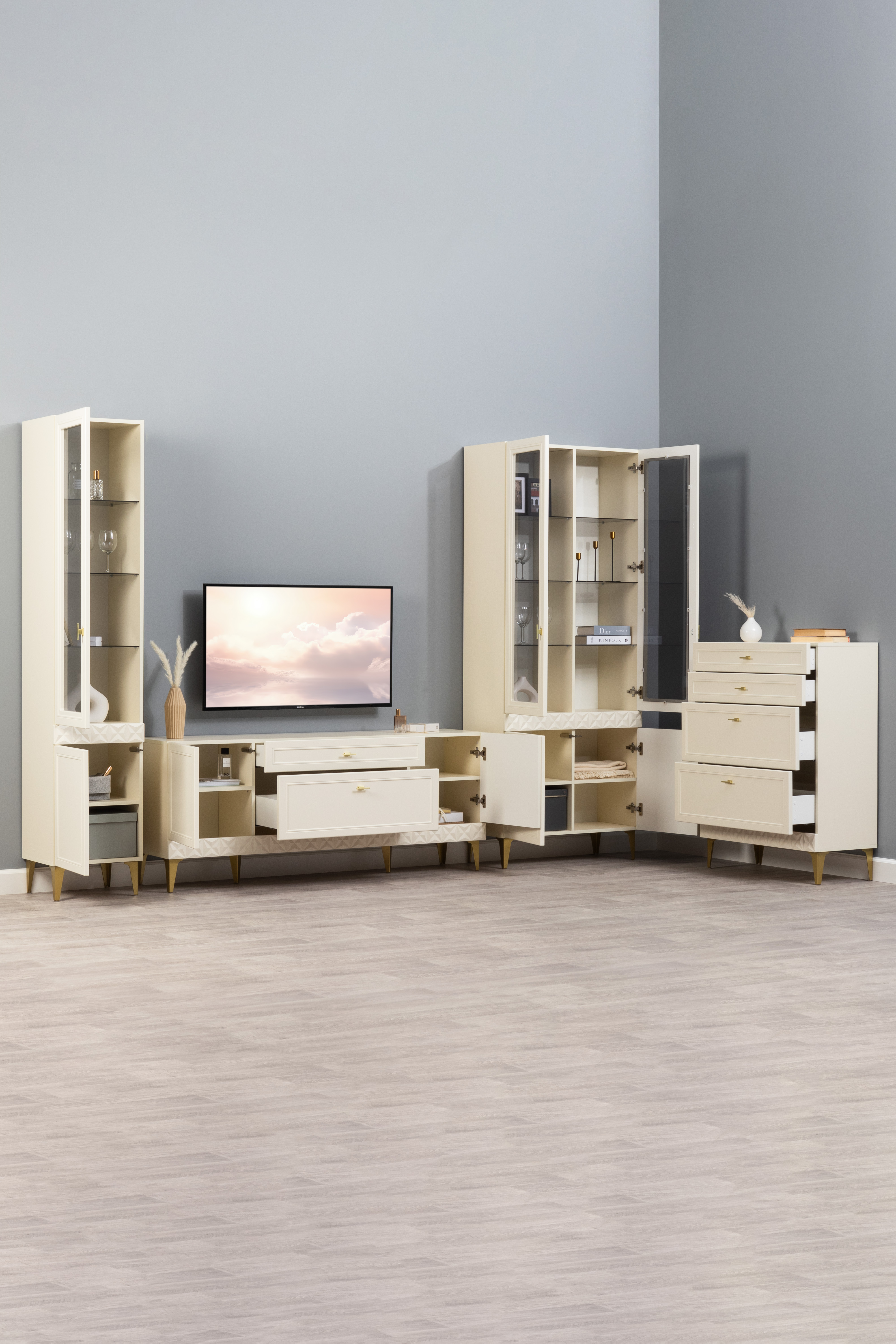 Шкаф-витрина Марион 16.397.01 слоновая кость С341 PE, слоновая кость 6898 ПВХ (собирается на любую сторону)