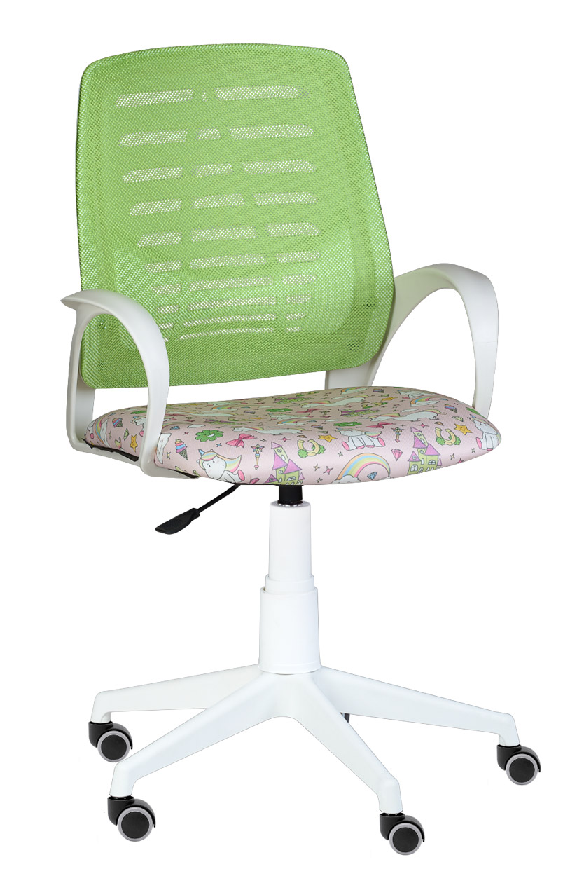 Кресло на колесах Ирис белый каркас, обивка сидушка - ткань саржа единороги, спинка салат,  подлокотники пластик, крестовина пластик, без качания