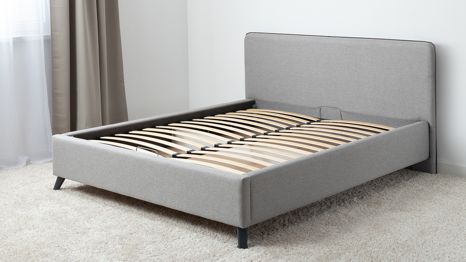 Основание кровати укомплектовано матрасодержателями. Жесткое кроватное дно из МДФ 6 мм. Задняя стенка изголовья выполнена в тех. ткани (спанбонд).