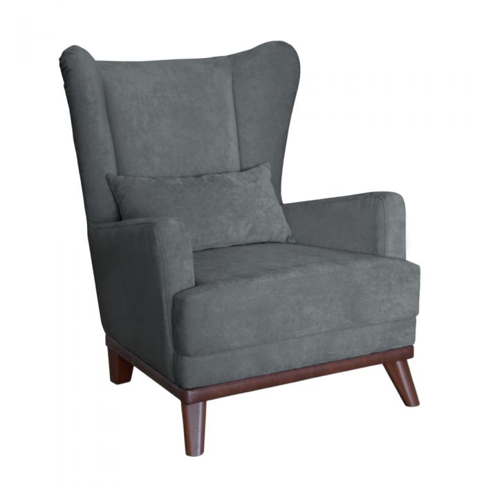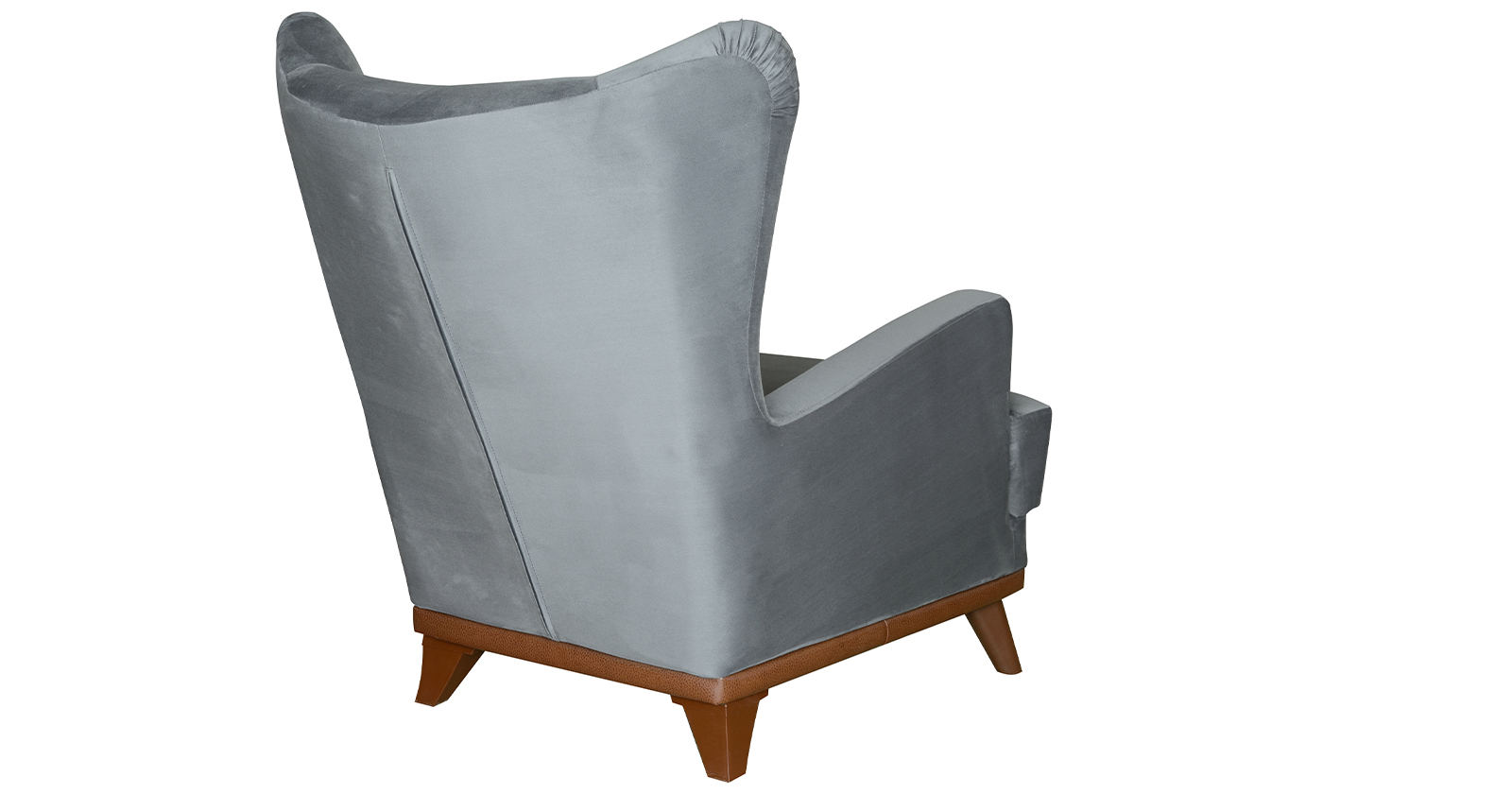 Высокая спинка с наклоном и мягкие подлокотники обеспечивают удобную посадку, дополнительный комфорт создает декоративная подушка. Царга кресла обтянута искусственной кожей в цвет опорам.