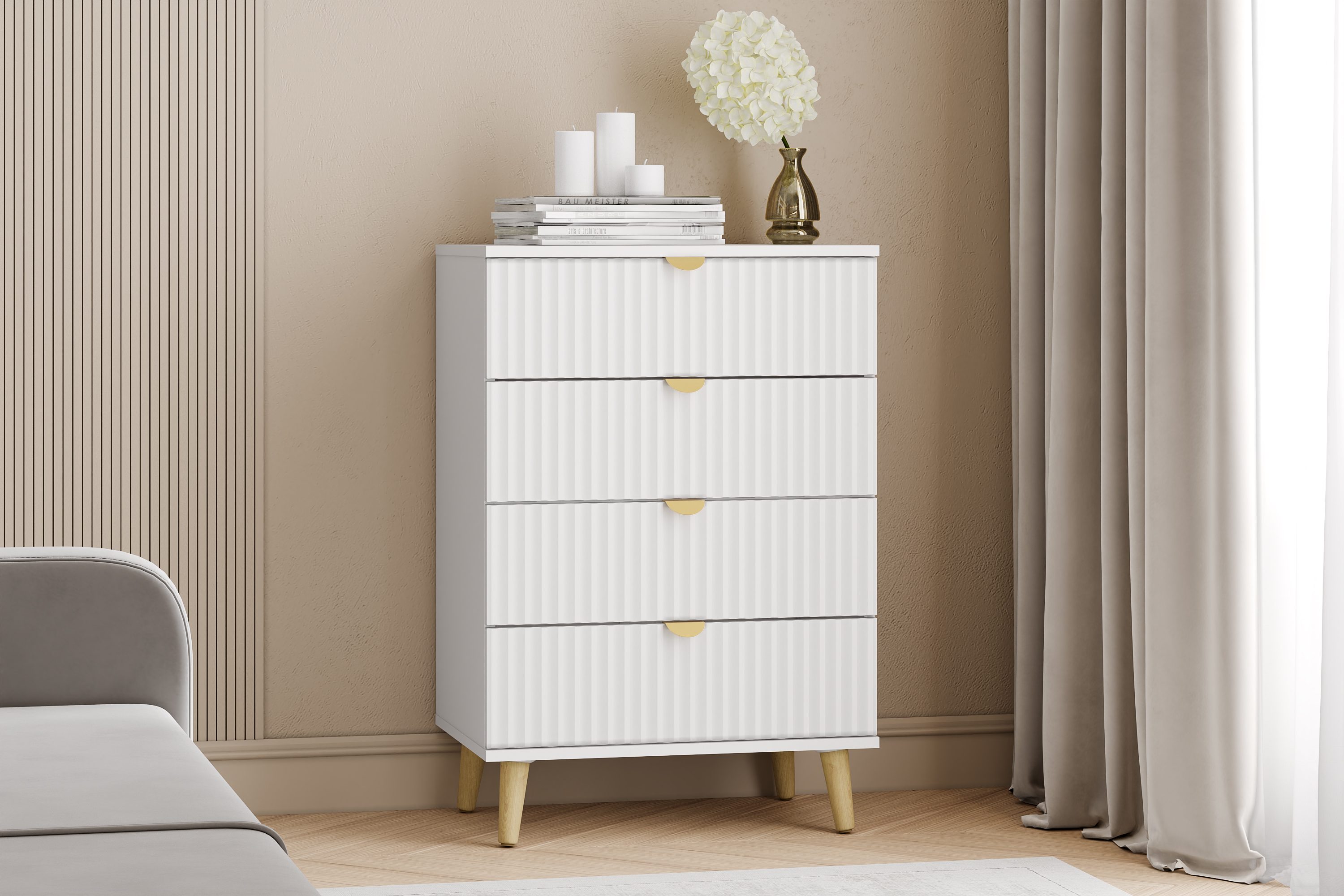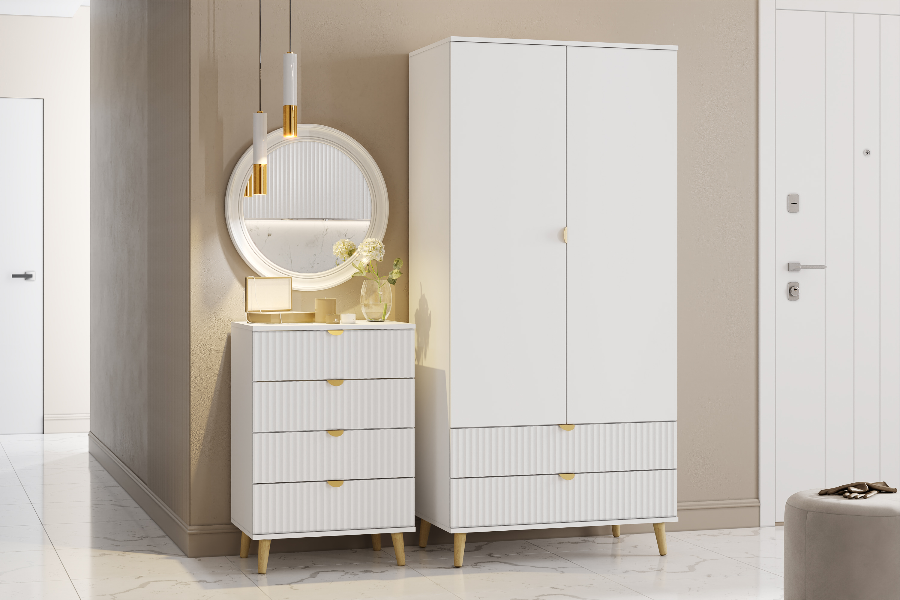 Модульная композиция включает комод, оснащенный выдвижными ящиками, которые открываются плавно и бесшумно благодаря шариковым направляющим, а в шкафу удобно организовать предметы одежды, при этом высокие опоры облегчают процесс уборки.
