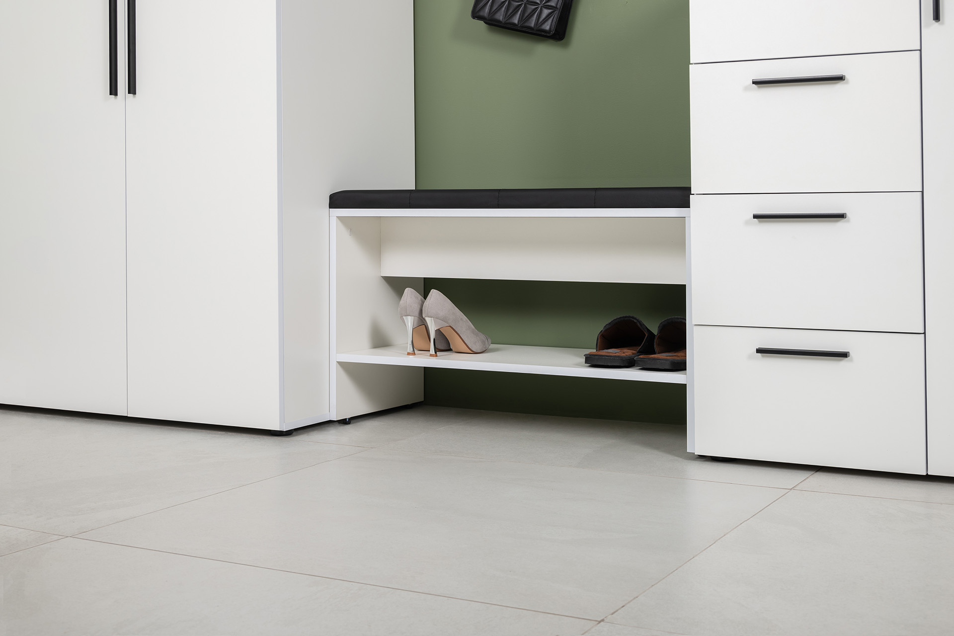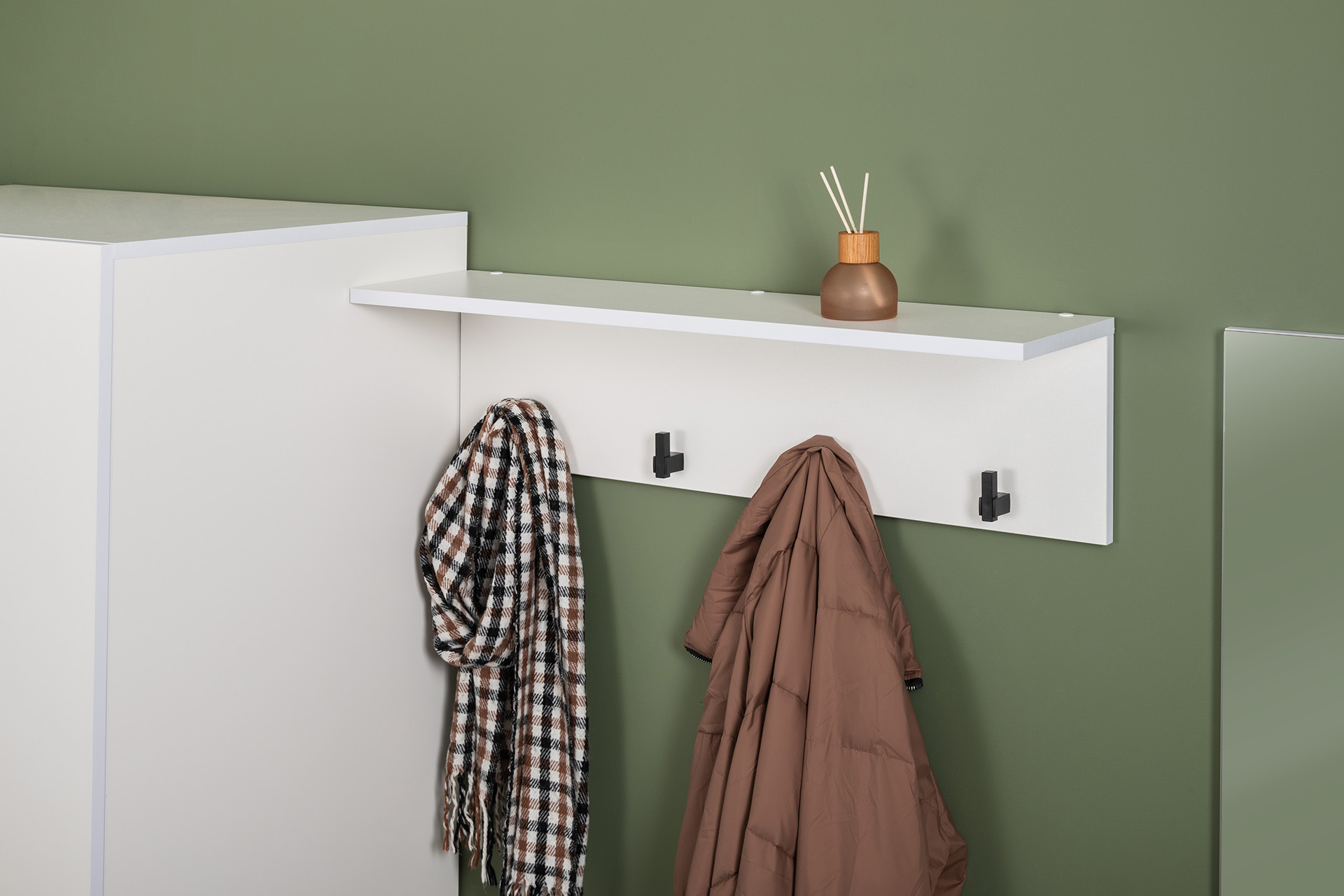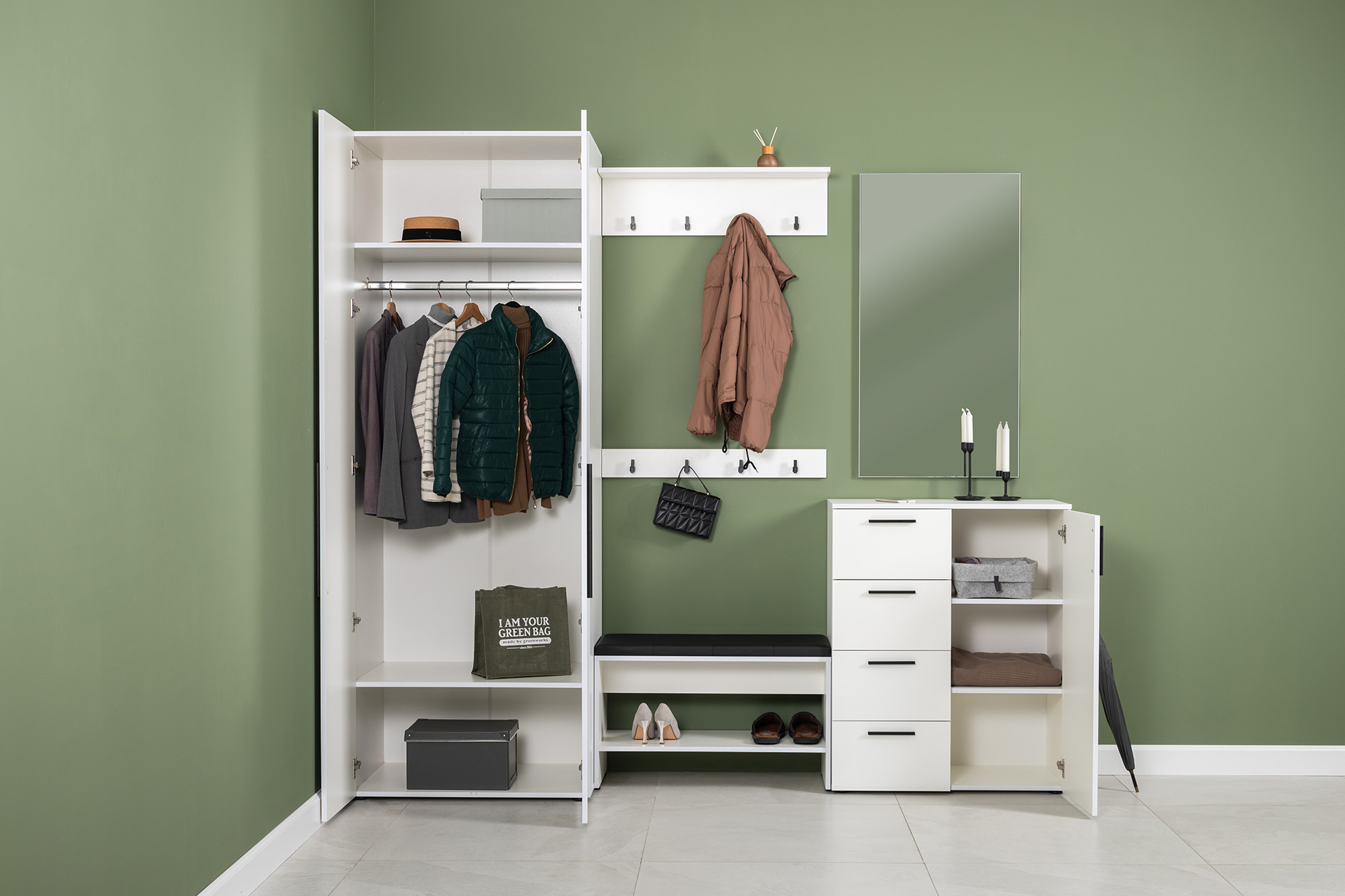 Вместительный шкаф полноразмерной глубины можно дополнить тумбой для обуви с мягким сиденьем и нишами для хранения, зеркалом и минималистичными вешалками.