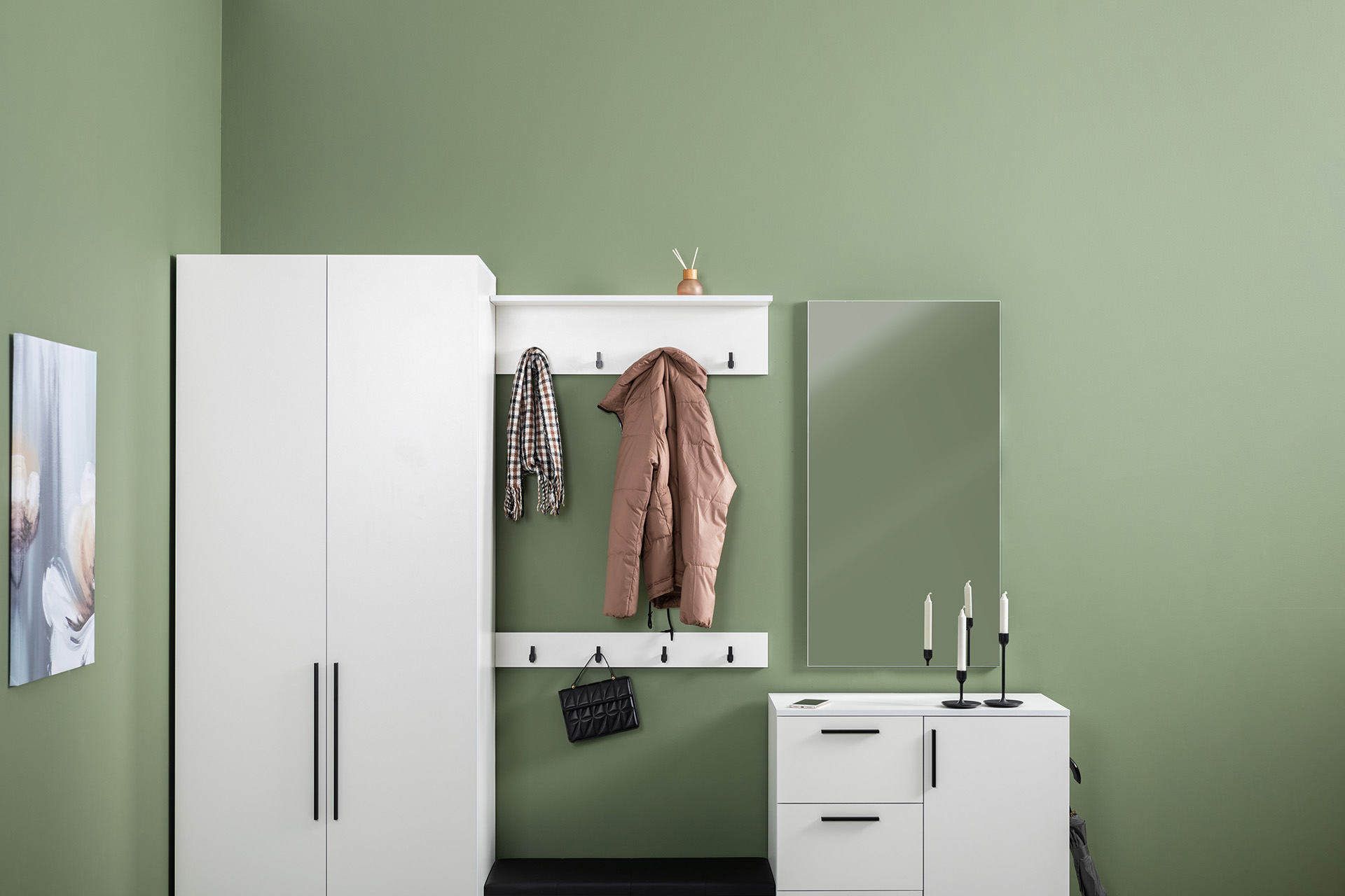 Нейтральный белый цвет визуально расширит ограниченное пространство прихожей.