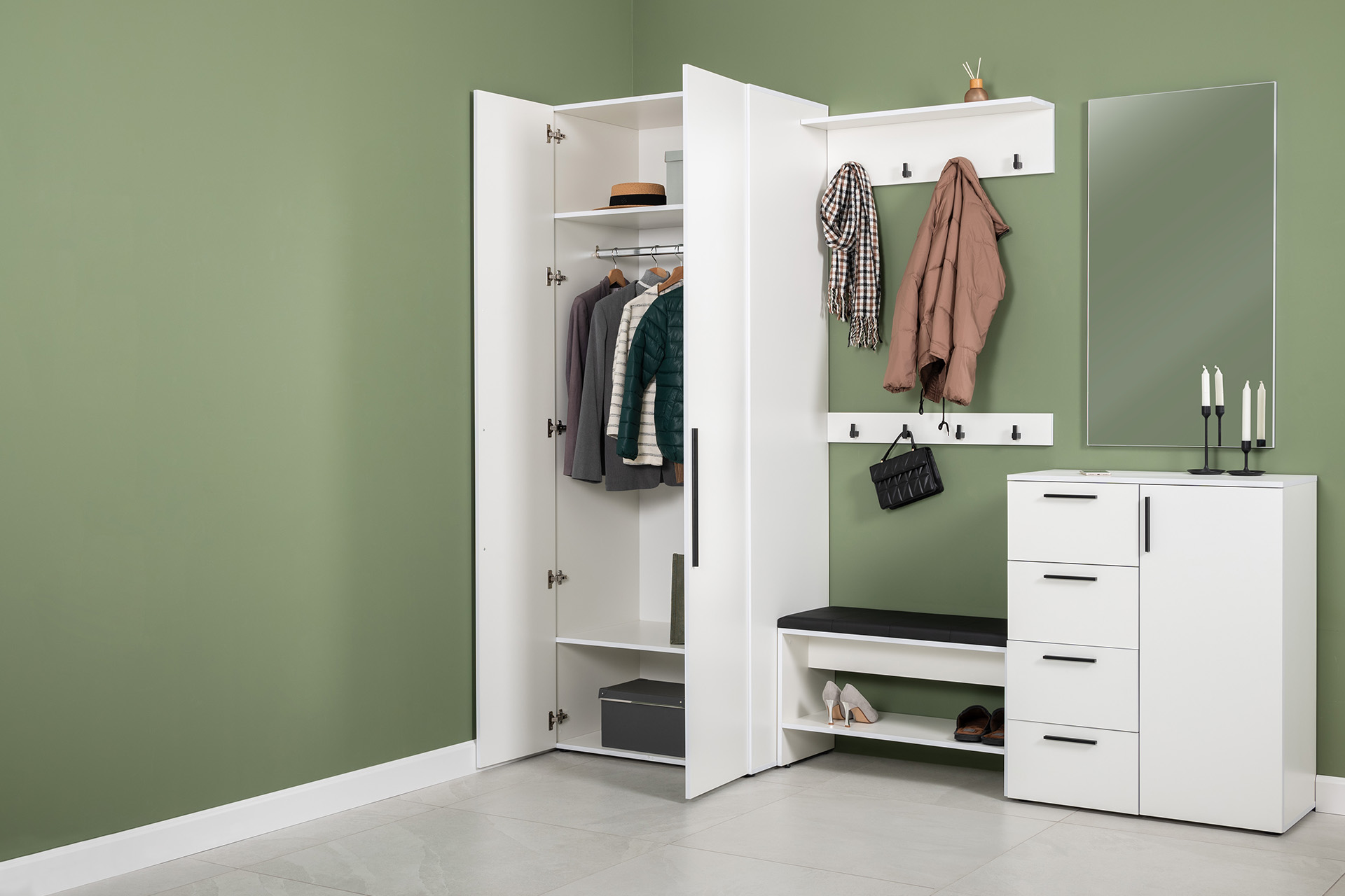 Нейтральный белый цвет визуально расширит ограниченное пространство прихожей.