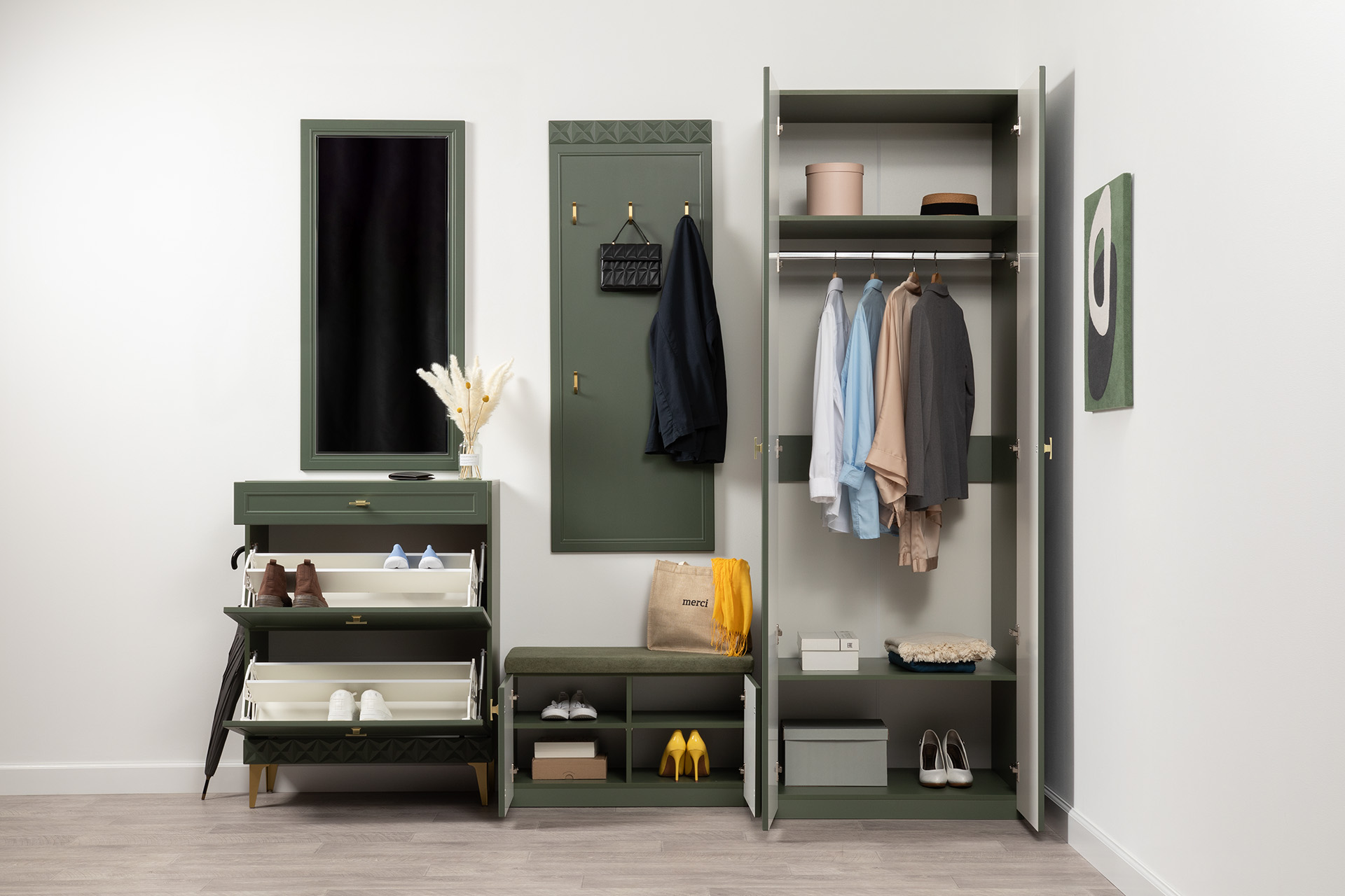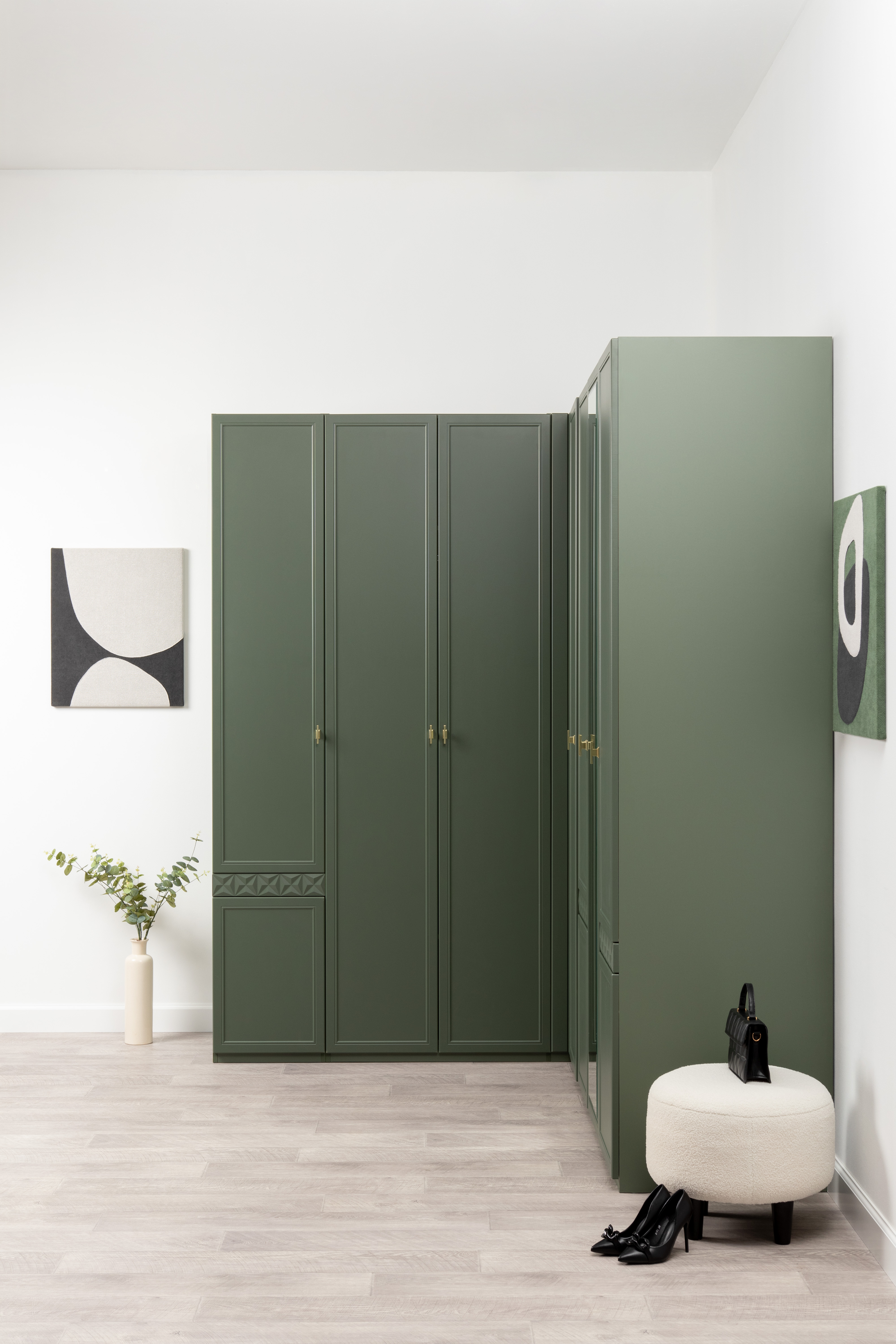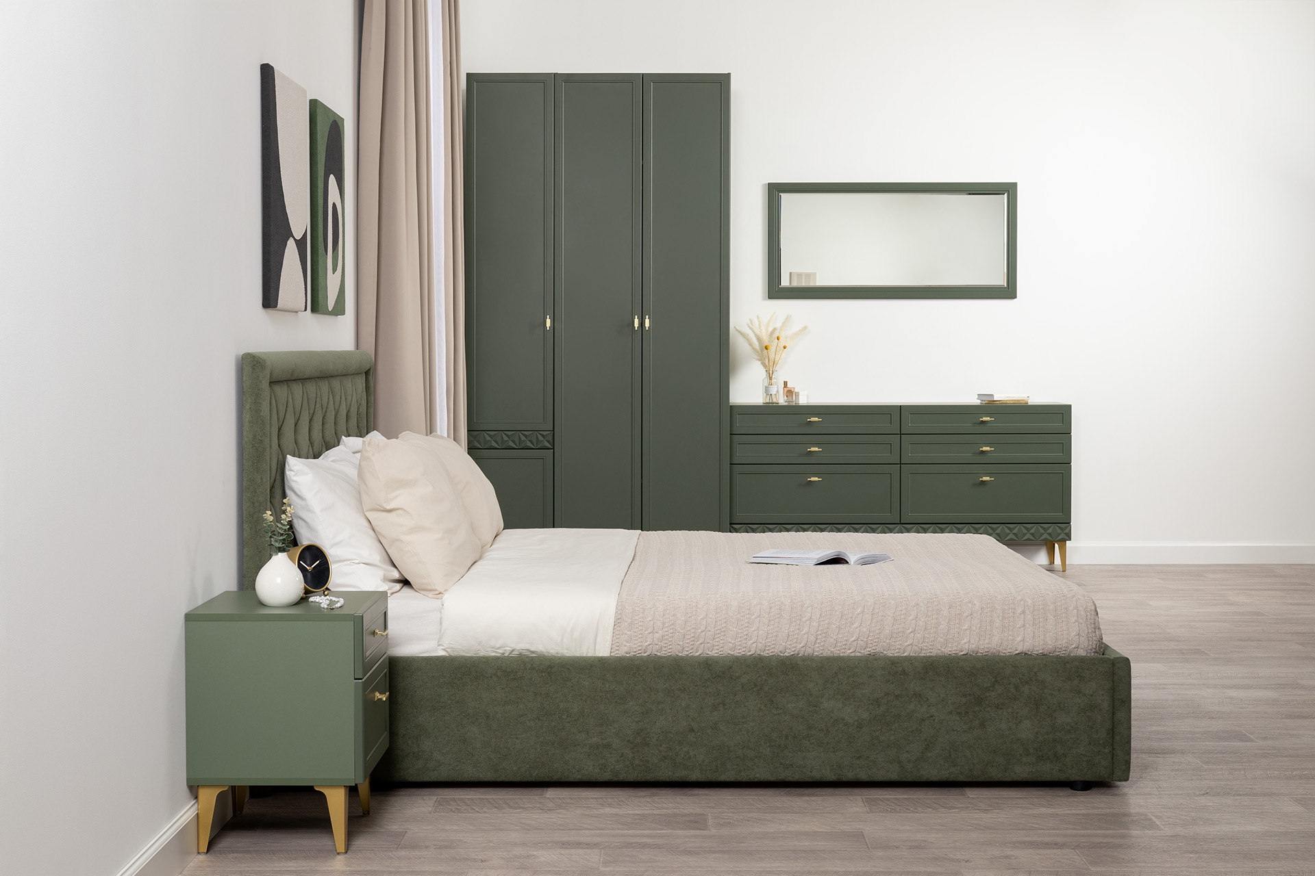 Изящные линии, глубокая фрезеровка фасадов из МДФ и благородные оттенки. Утончённая «Слоновая кость» и изысканная «Олива Шагрень» с глубоким зелёным тоном — создают атмосферу уюта, тепла и благородства. Металлические ручки и опоры золотого цвета придают мебели утончённый блеск, а петли и направляющие с доводчиками обеспечивают плавное и бесшумное закрытие фасадов.