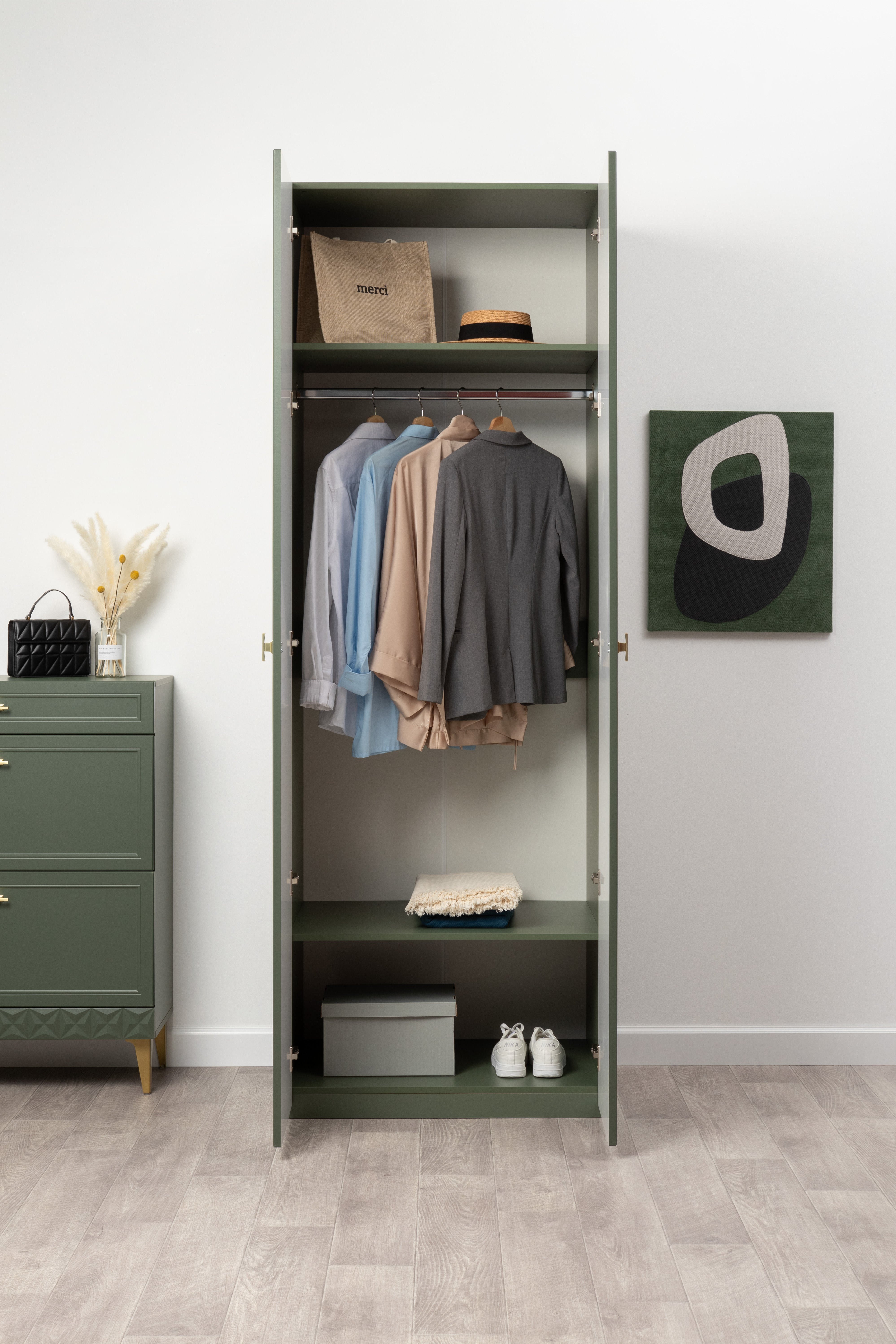 Шкаф двустворчатый Марион 16.340.02 дымчатый зеленый K521, олива шагрень AG 1050 ПВХ