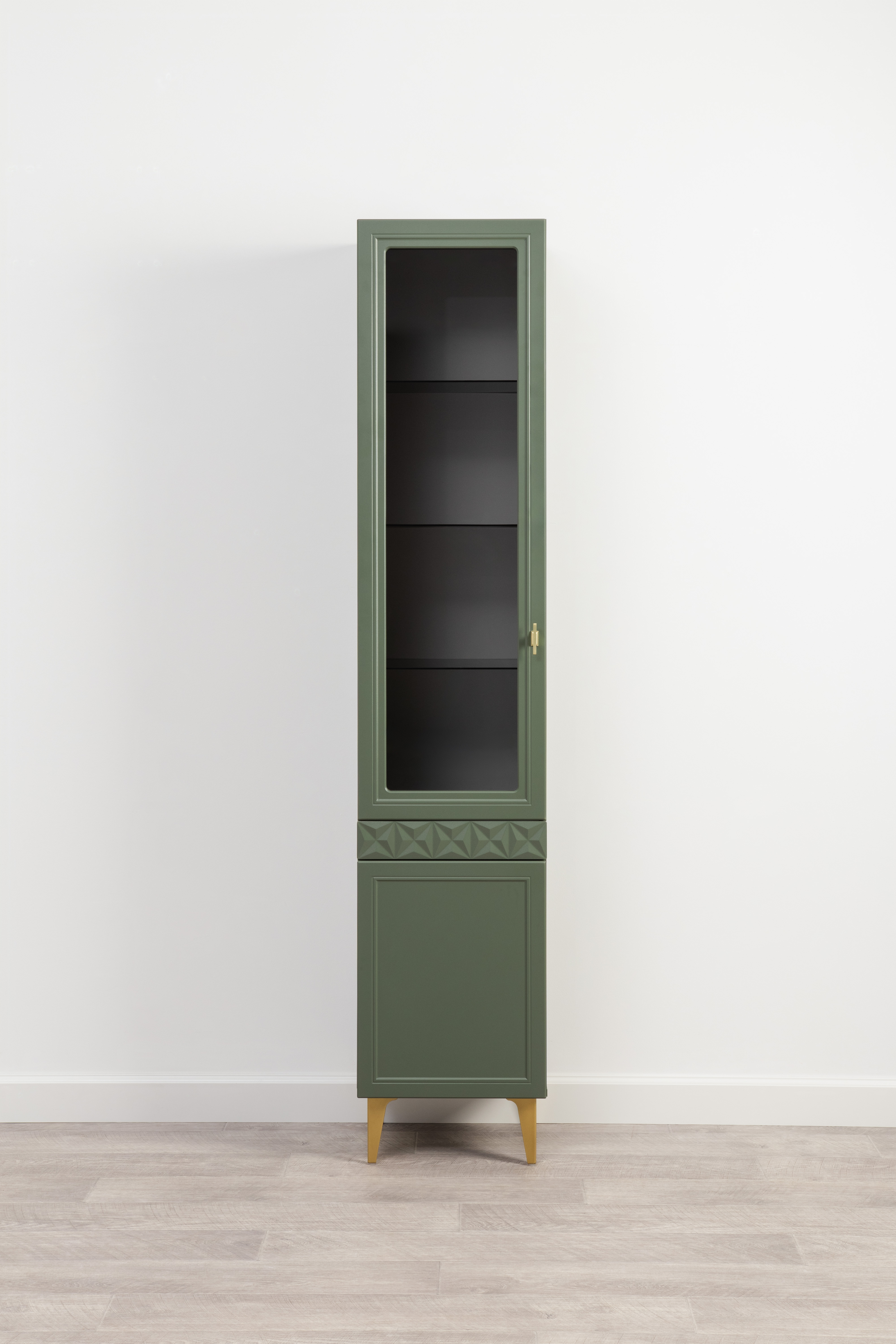Шкаф-витрина Марион 16.397.01 дымчатый зеленый K521, олива шагрень AG 1050 ПВХ (собирается на любую сторону)