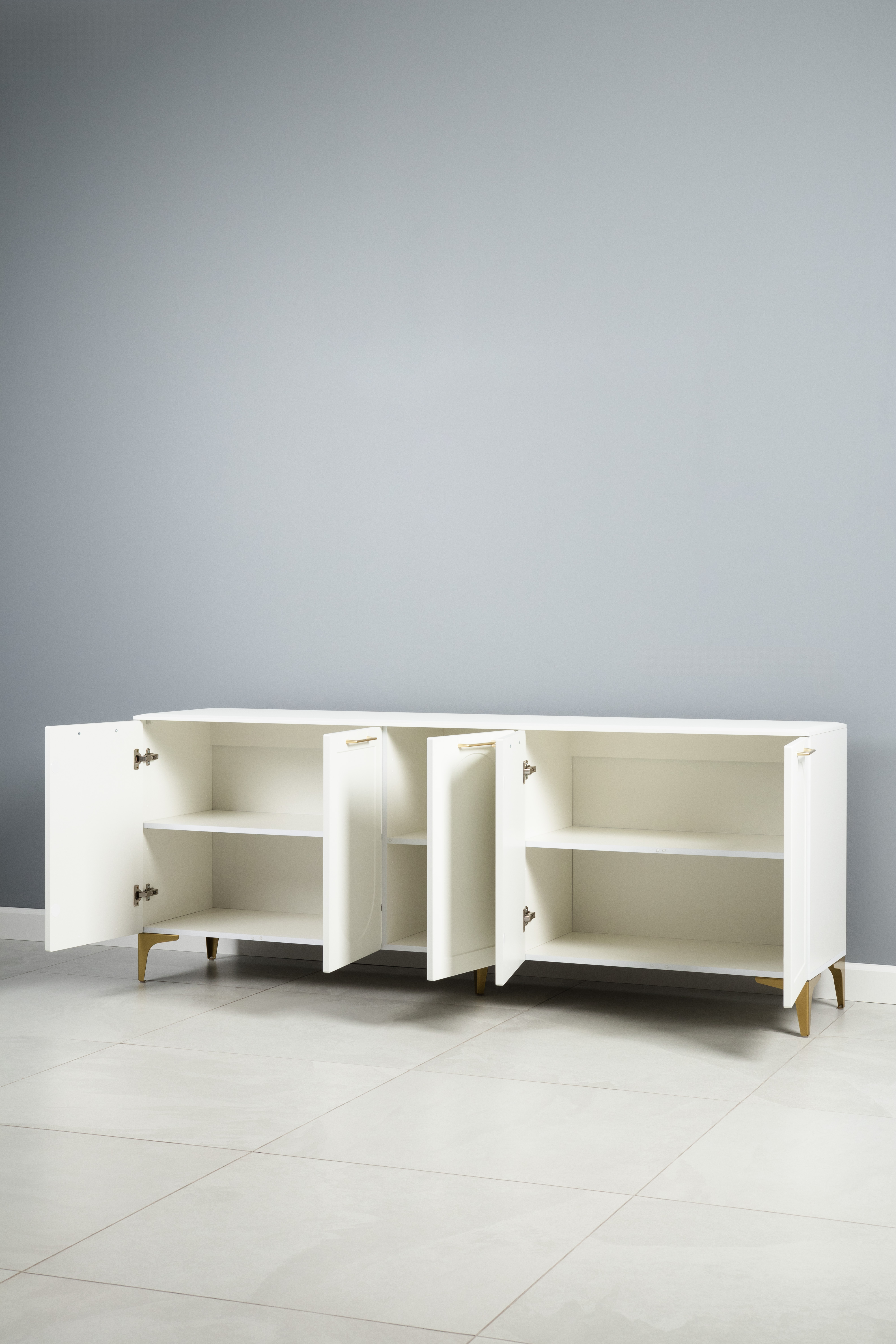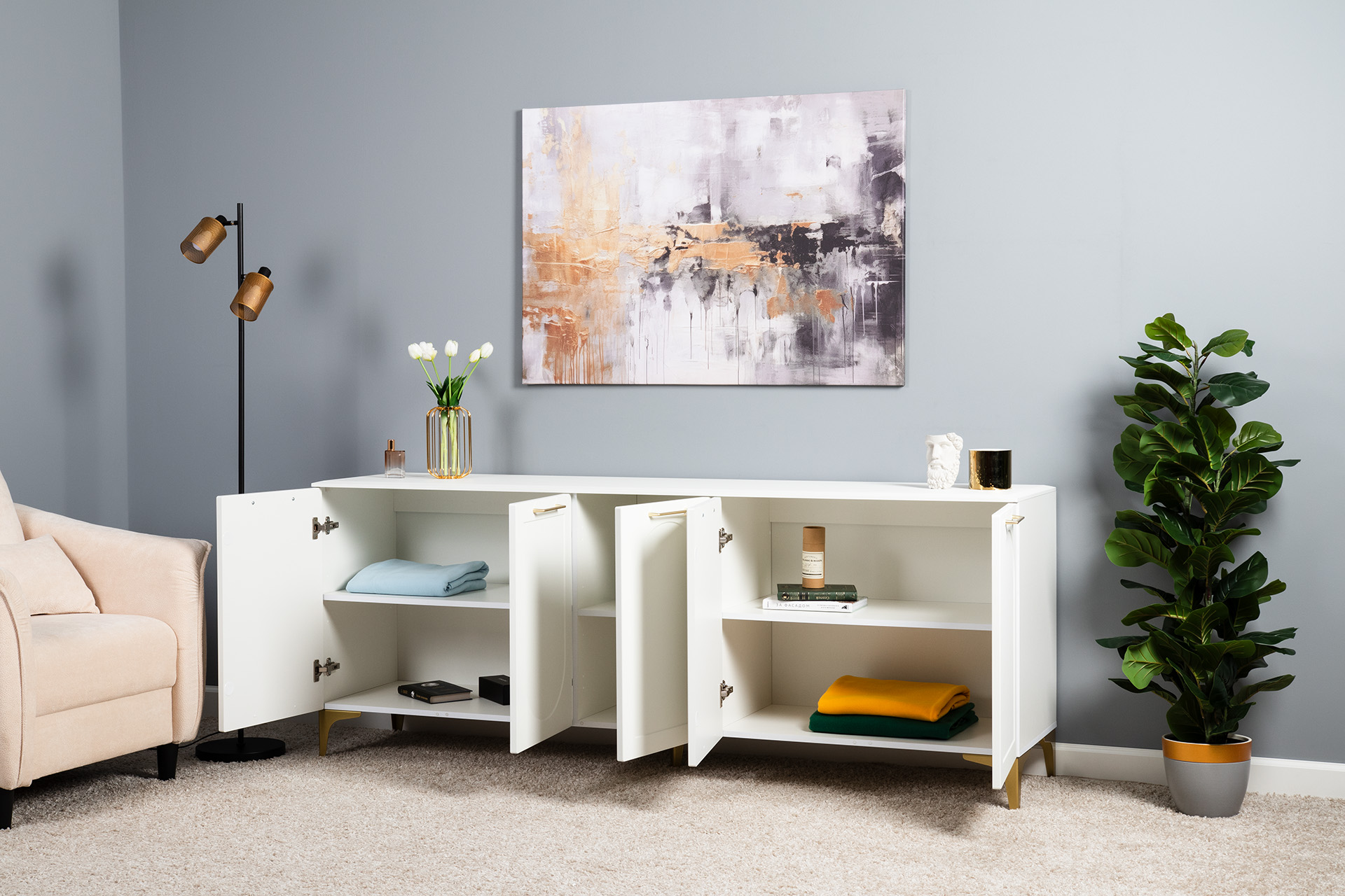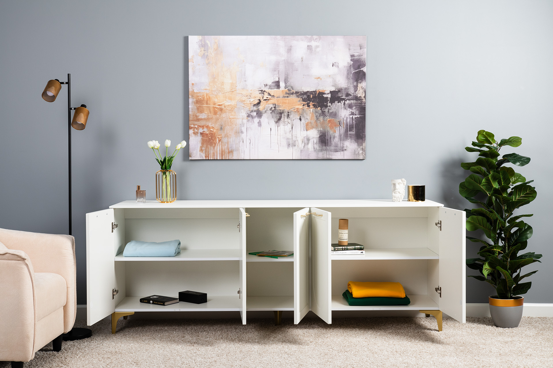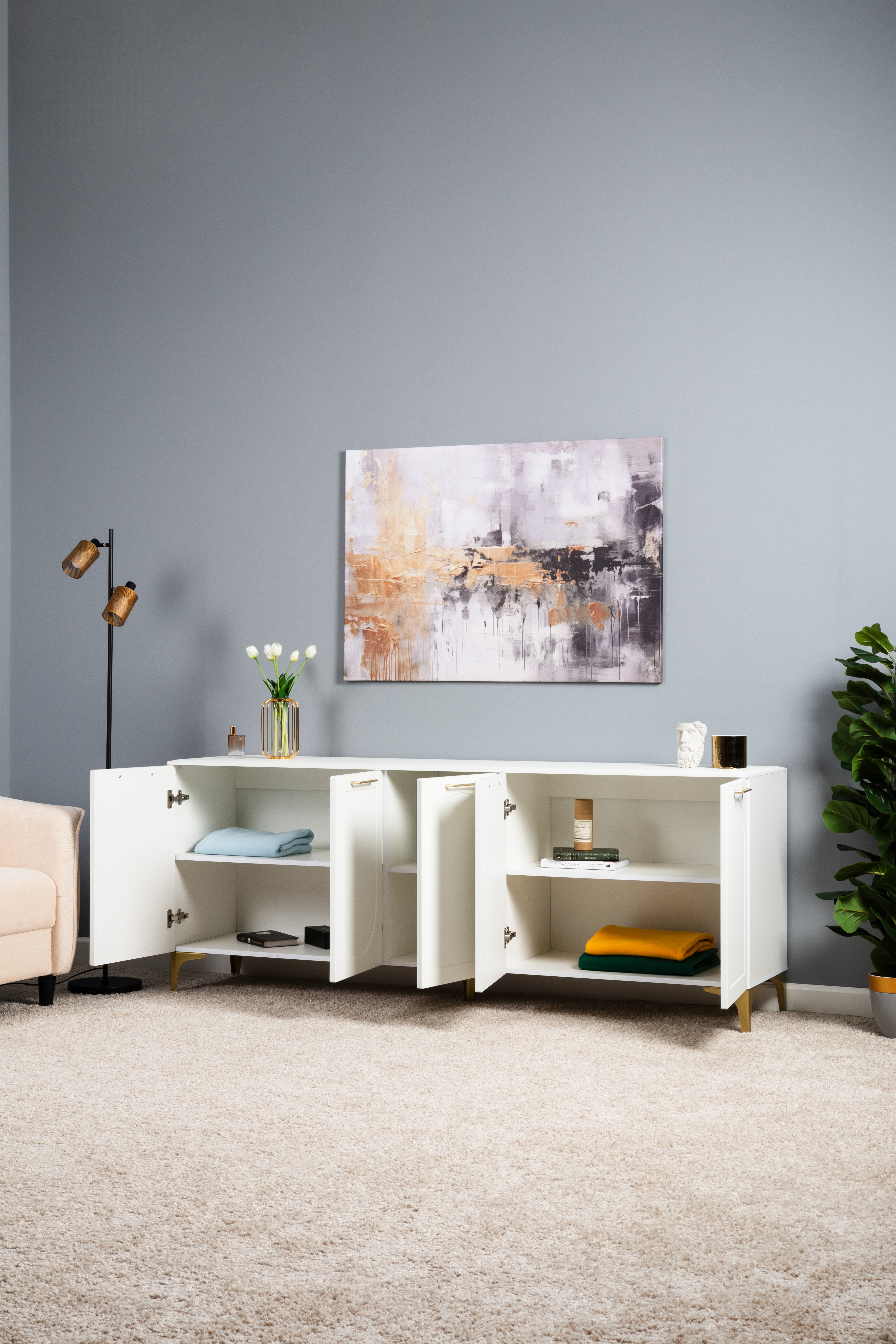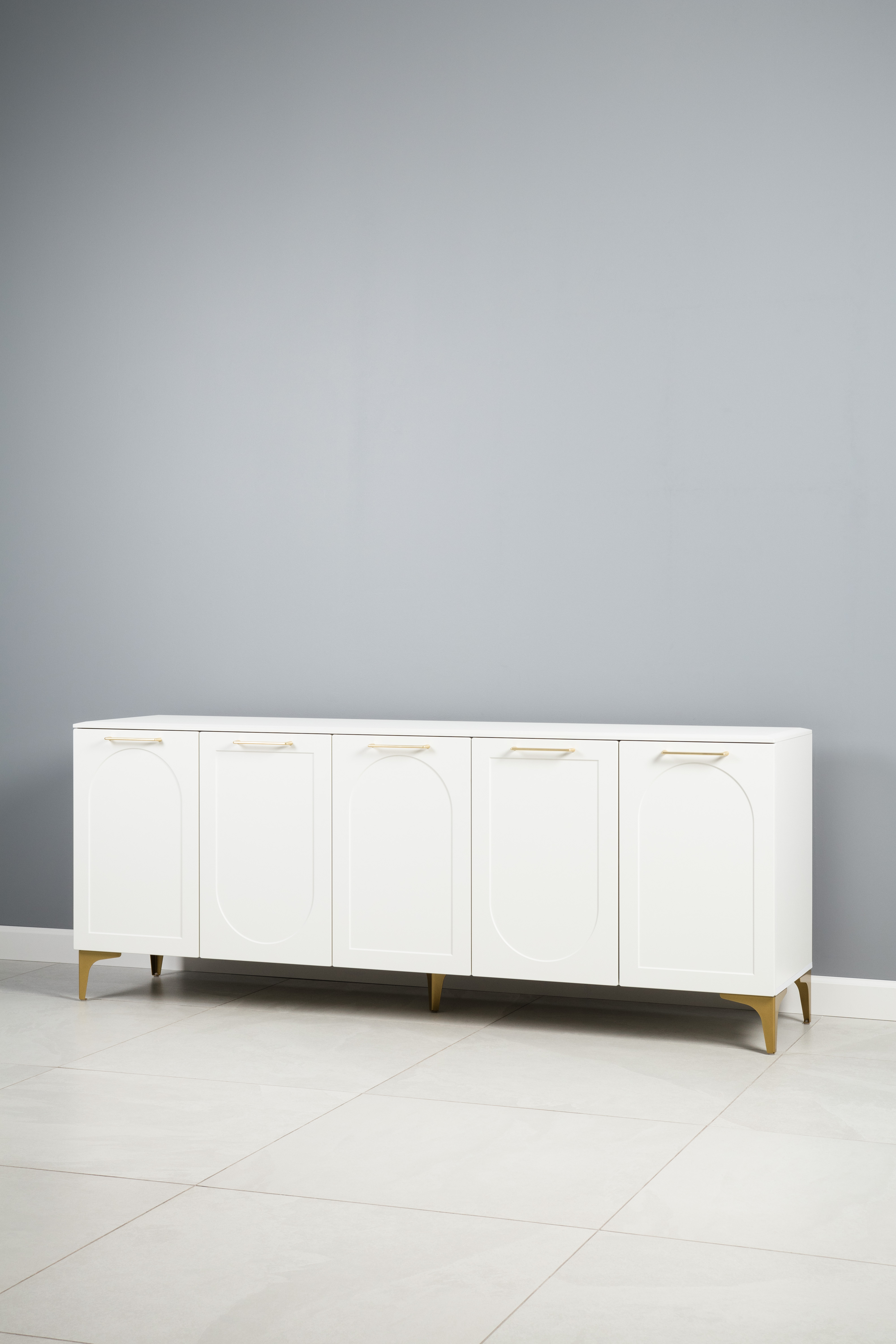 Тумба под ТВ в гостиную Петра 13.281 белый PE шагрень, милк софт ПВХ, бетон чикаго беж ПВХ