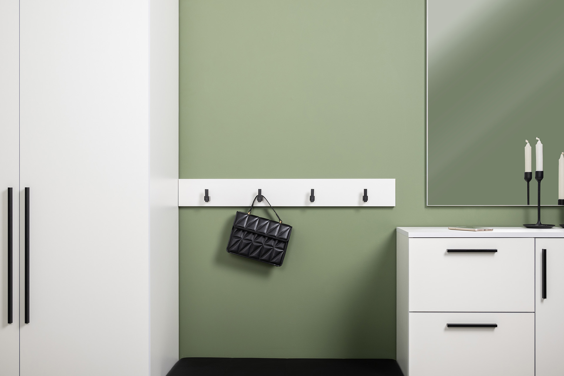 Вместительный шкаф полноразмерной глубины можно дополнить тумбой для обуви с мягким сиденьем и нишами для хранения, зеркалом и минималистичными вешалками.